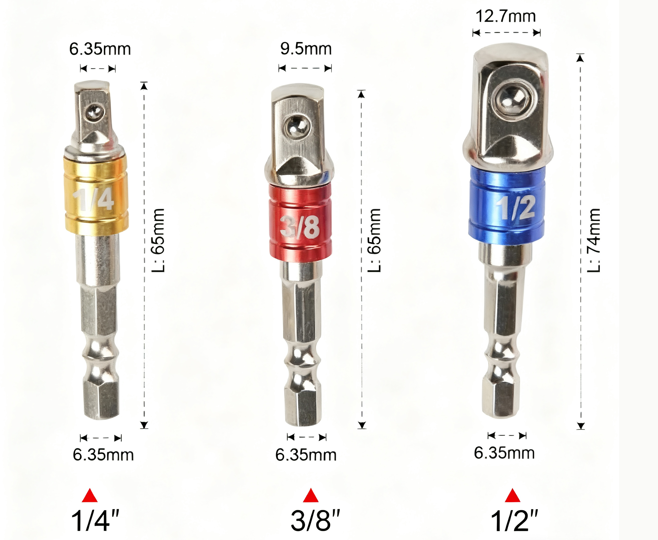 POSIZIONE > Casa > CENTRO PRODOTTI > Accessori > Adattatore > Set di adattatori per bussole a impatto da 1/4" 3/8" 1/2" con gambo esagonale multicolore